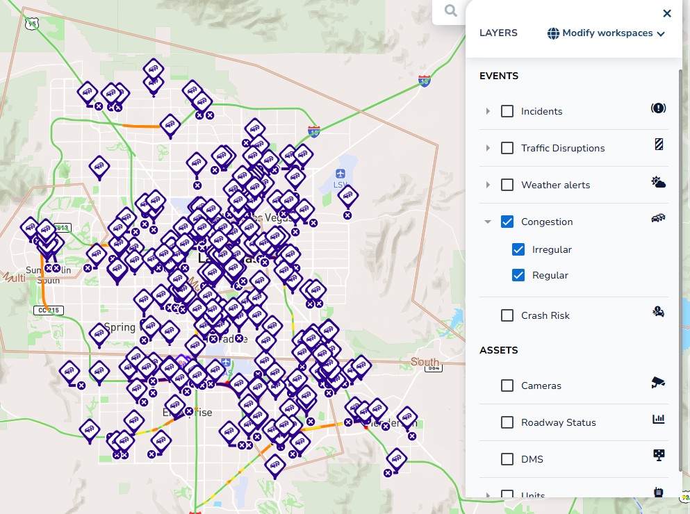 Assets display the assets that are currently deployed in the live map area. These include cameras, roadway status, digital signs, and units.