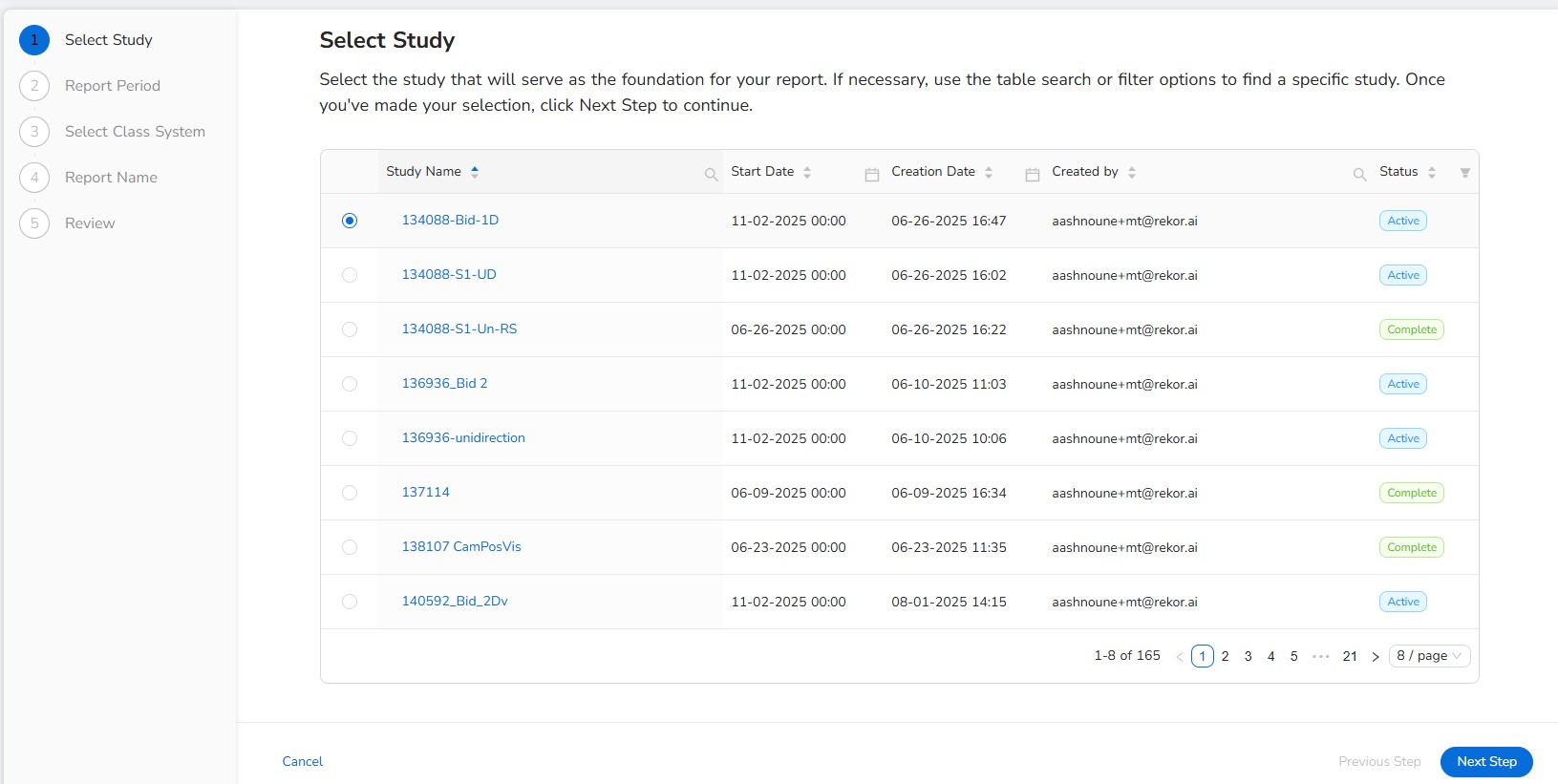 Select the study that will serve as the foundation for your report. If necessary, use the table search or filter options to find a specific study. Once you've made your selection, click Next Step to continue.