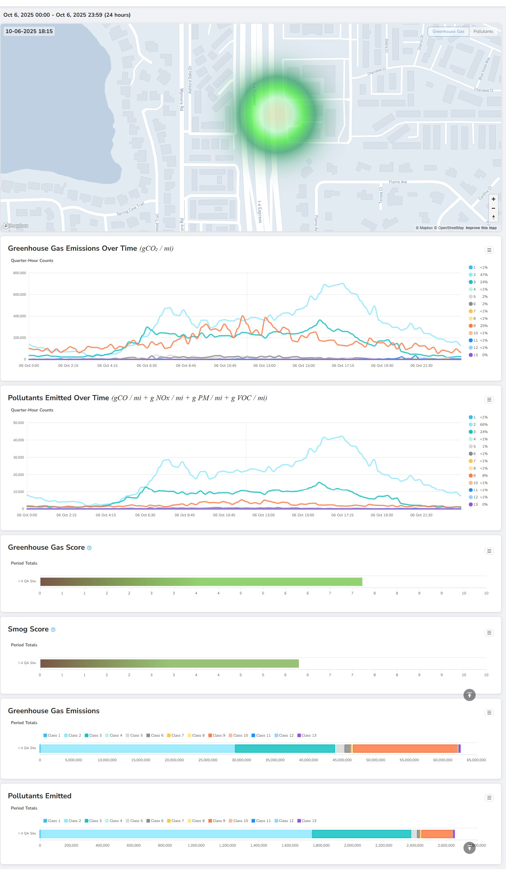 The Greenhouse Gas report displays a map showing the area affected by green house gas emissions, greenhouse gas emissions over time, pollutants emitted over time, a greenhouse gas score, a smog score, greenhouse gas emissions per vehicle class, and pollutants emitted per vehicle class.