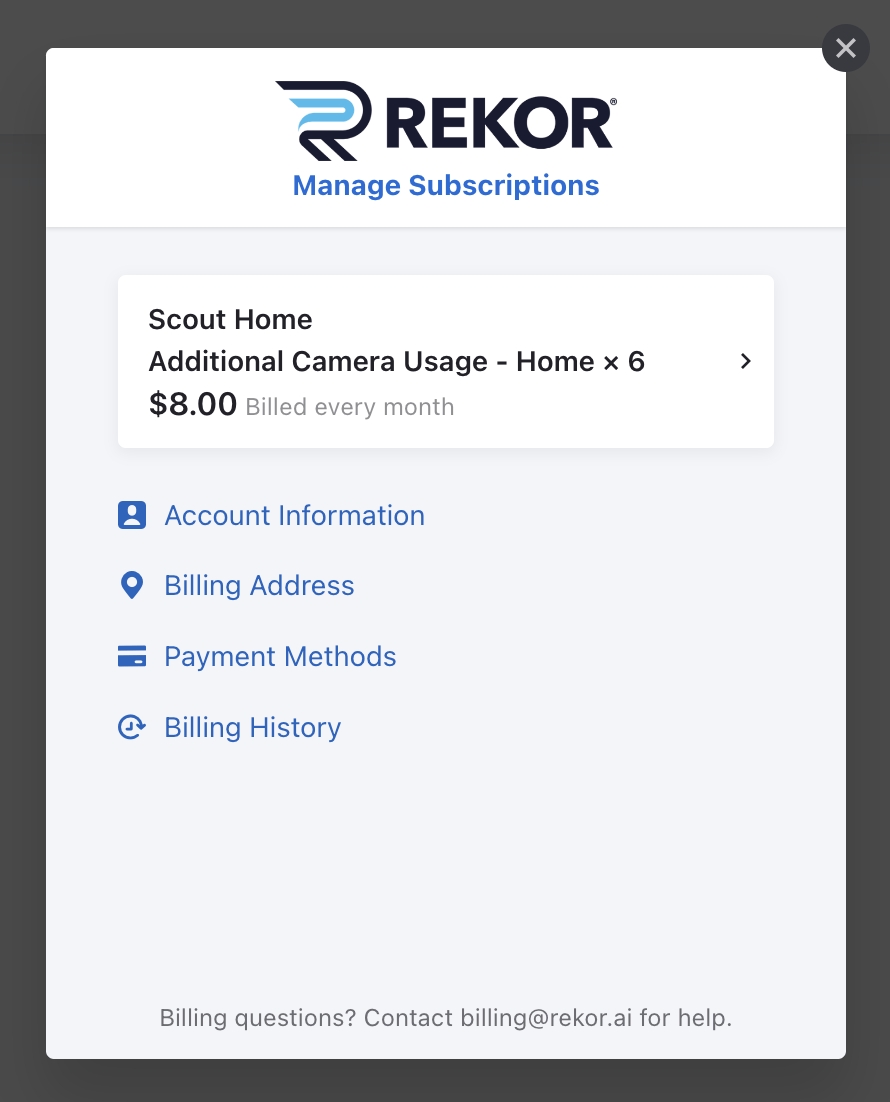 Account information and subscription details can be accessed within the Billing and Subscriptions popup menu, including Subscriptions, Account Information, Billing Address, Payment Methods, and Billing History.