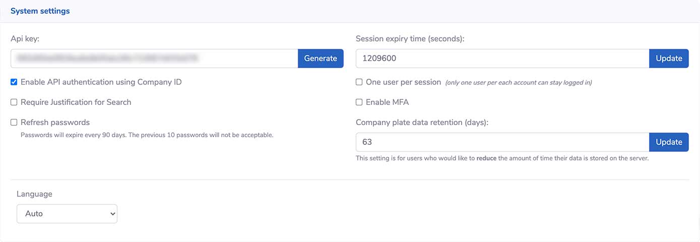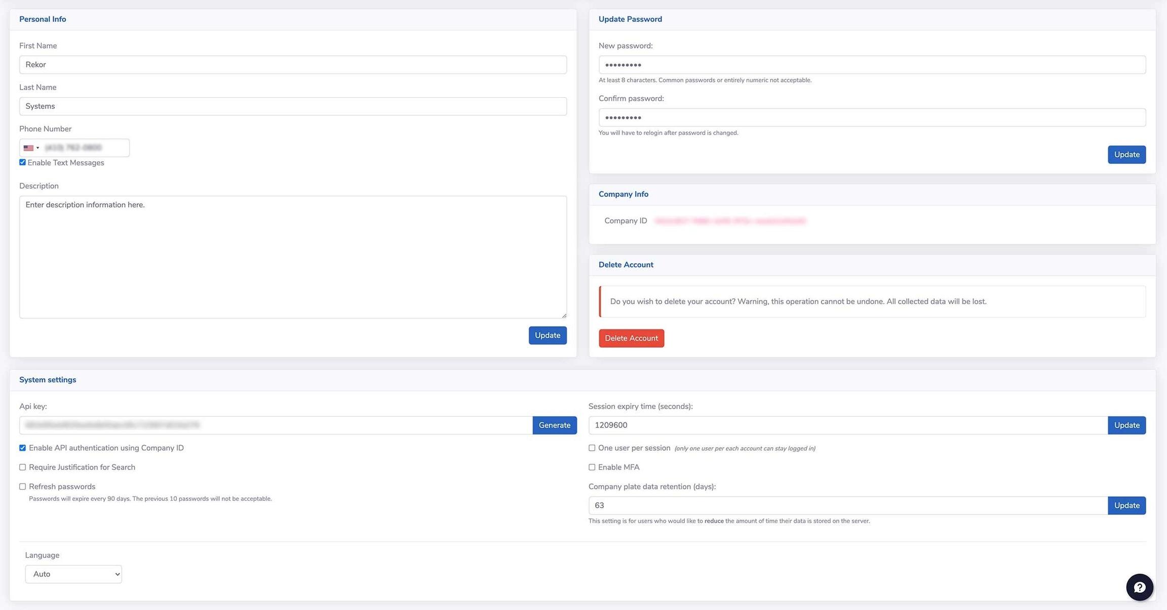 As shown below, the account’s specific usage settings can be changed under the “System Settings” section. You can also generate an API Key to programmatically interact with the Rekor Scout™ backend. By selecting “Enable API authentication using Company ID” you can replace the API Key with the Company ID.