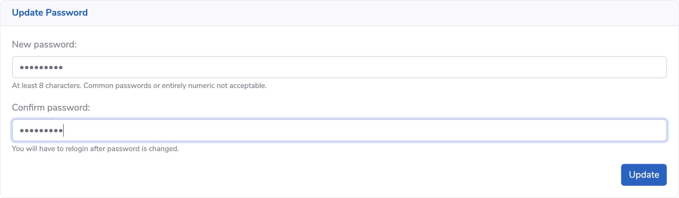 You may need to update your password for security purposes and/or as needed. Enter a new password following the requirements (fine prints below the text box) and confirm it in the second text box. Click “Update” to save changes.