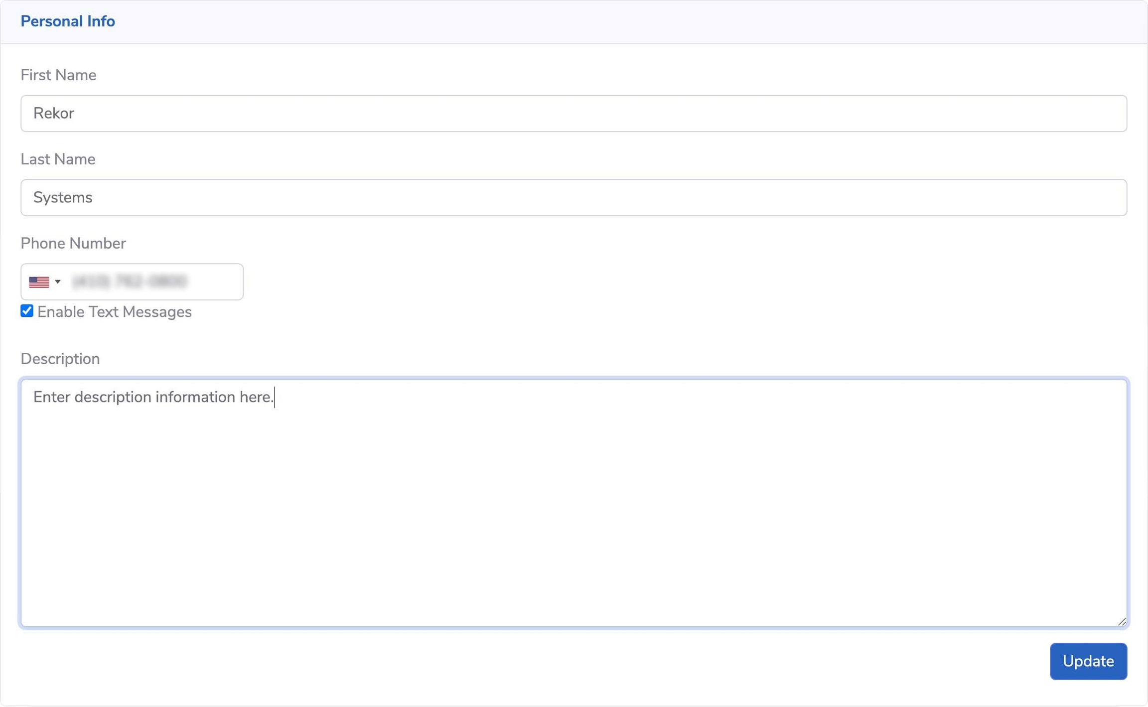 As shown below, a full name, phone number, and a brief user description can be entered and reviewed under the “Personal Info” section.