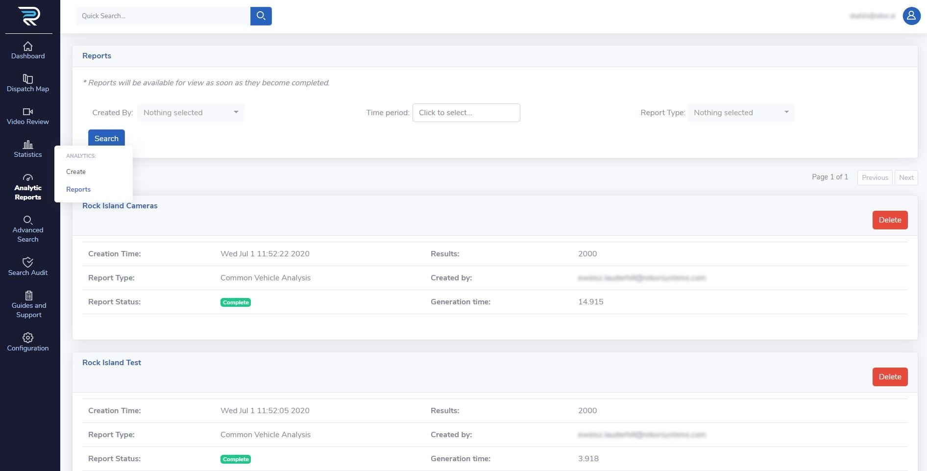 Using the search panel on the “Reports” module (top of the page) previously created reports can be searched or filtered based on the generating user, creation time period, and report type. Reports falling within the search criteria will be displayed.