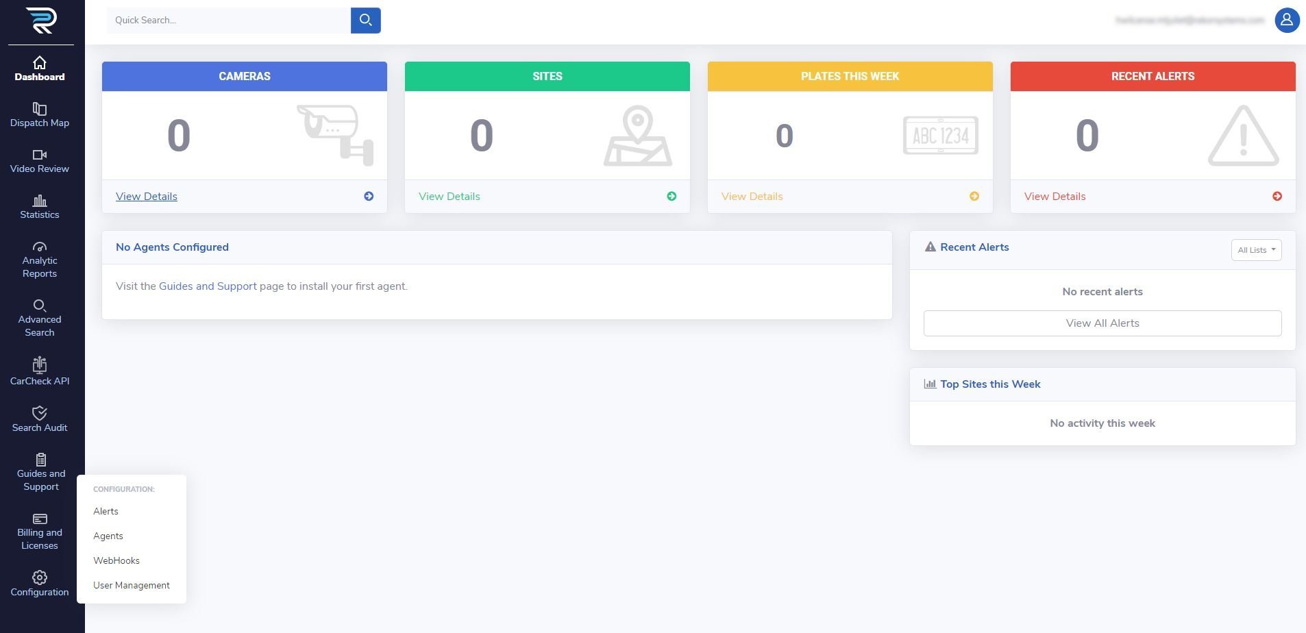 menu provides a management center to introduce and configure all involved items of your LPR system. Alerts, Agents, WebHooks, and Users can be created and managed under this menu and are described in more detail below.