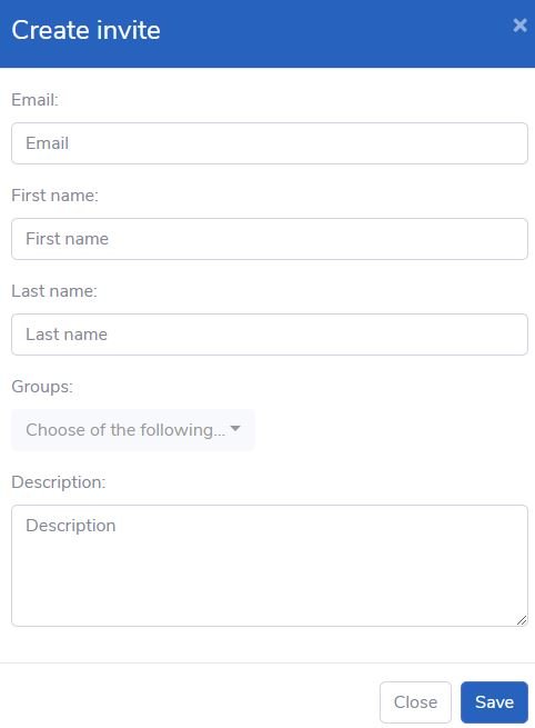 button opens a separate form to input information about the invitee including “Email”, “First name”, “Last name”, “Groups”, and “Description” about the user, field of operation, or other related information to be noted on your profile.