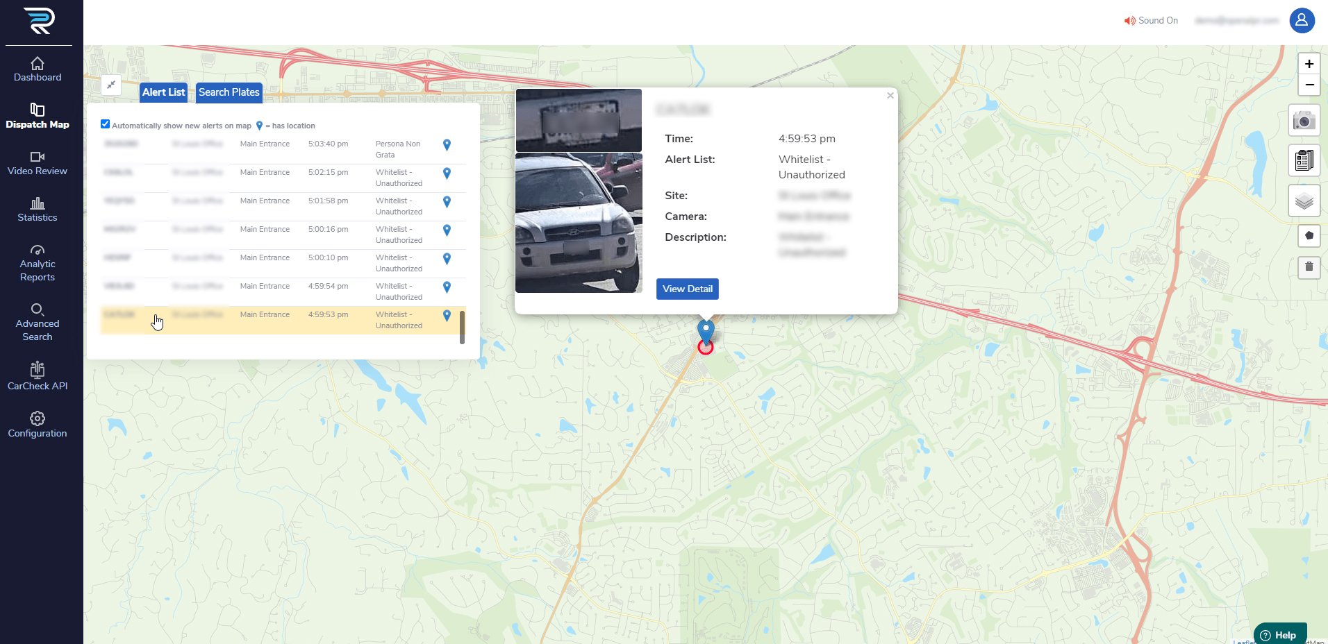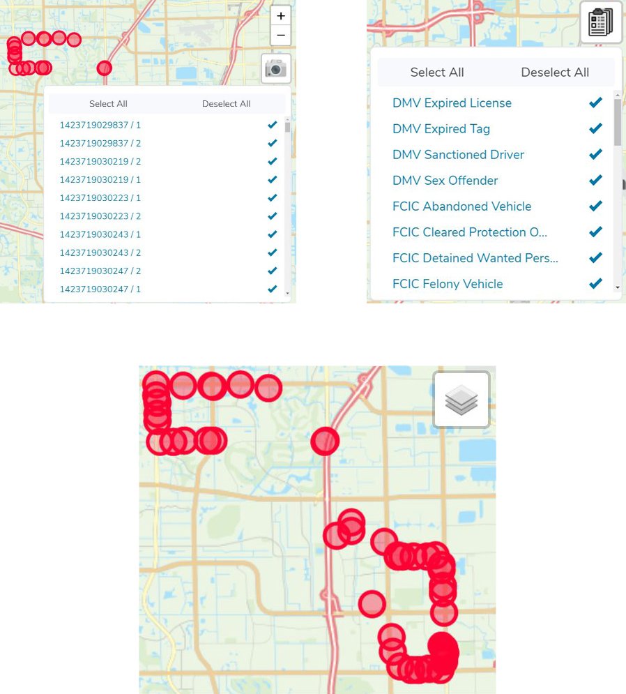 Once the “Automatically show new alerts on map” feature is activated (as shown above), the map view on the “Dispatch Map” screen is refreshed with the provided/actual location of the latest captured plate on the alert list.