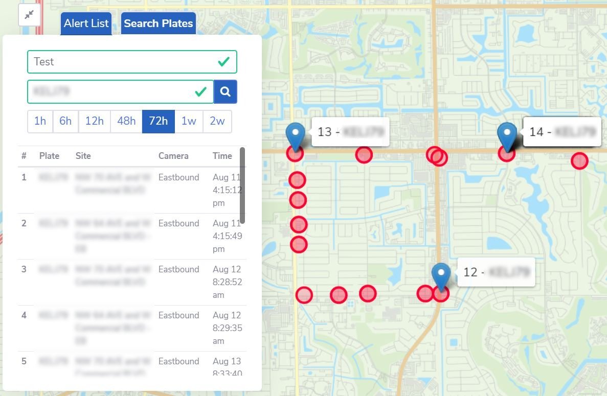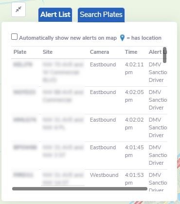 Real-time alert lists and the ability to search for specific plates are available within the map-view presentation under the Alert List and Search Plates tabs, respectively.