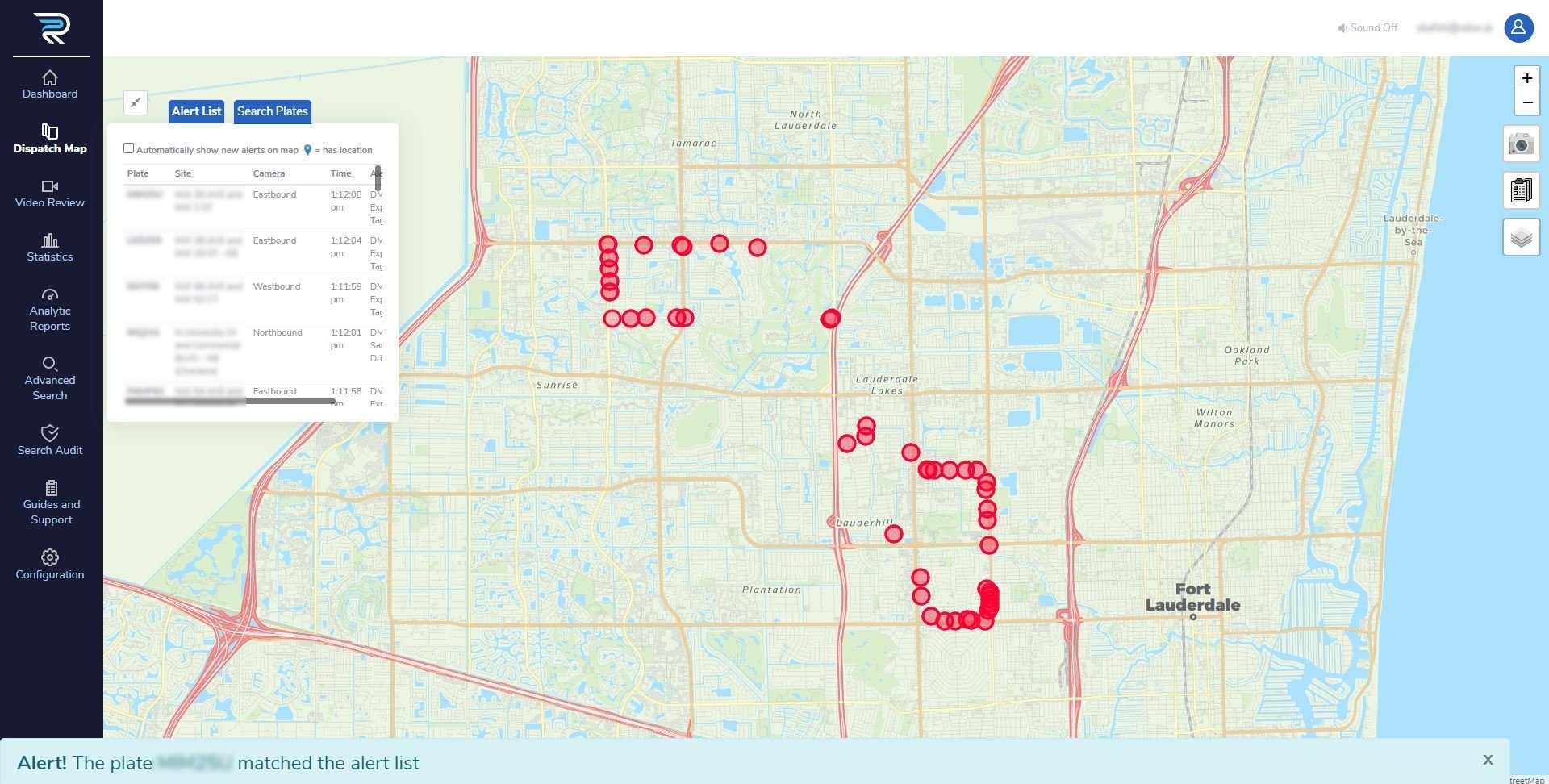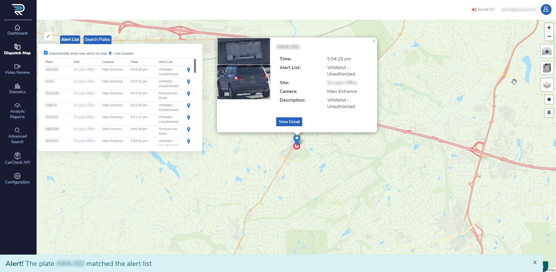 The Dispatch Map page displays both historical and real-time vehicle captures on a graphical map based on camera sites.