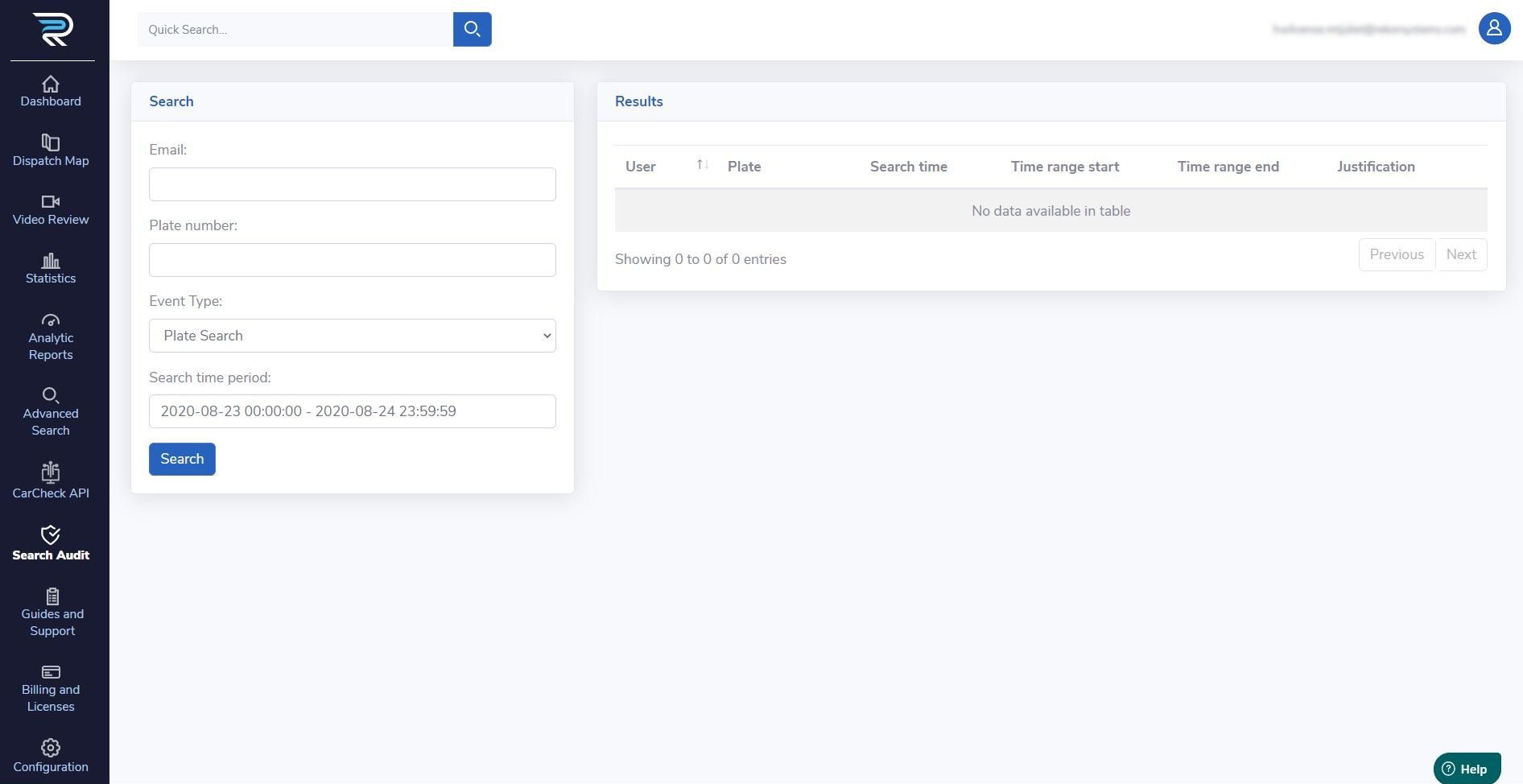 Allows administrators to narrow the audit based on “Email, “Plate Numbers, “Event Type”, and “Search Time”.