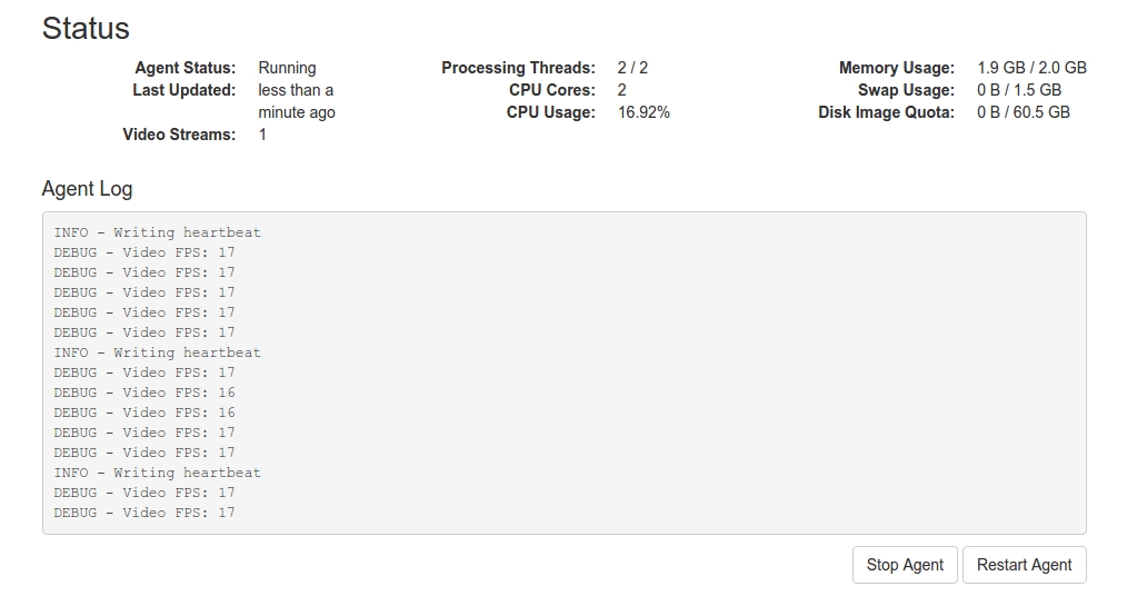 Once the Agent is configured and connected to a camera stream, it will continue collecting data from the configured video streams. If the Agent’s computer is rebooted, it will automatically start. If the camera goes down or the network becomes temporarily inoperative, the Agent will retry until connectivity is restored. All results will be queued, so no data will be lost in an outage.